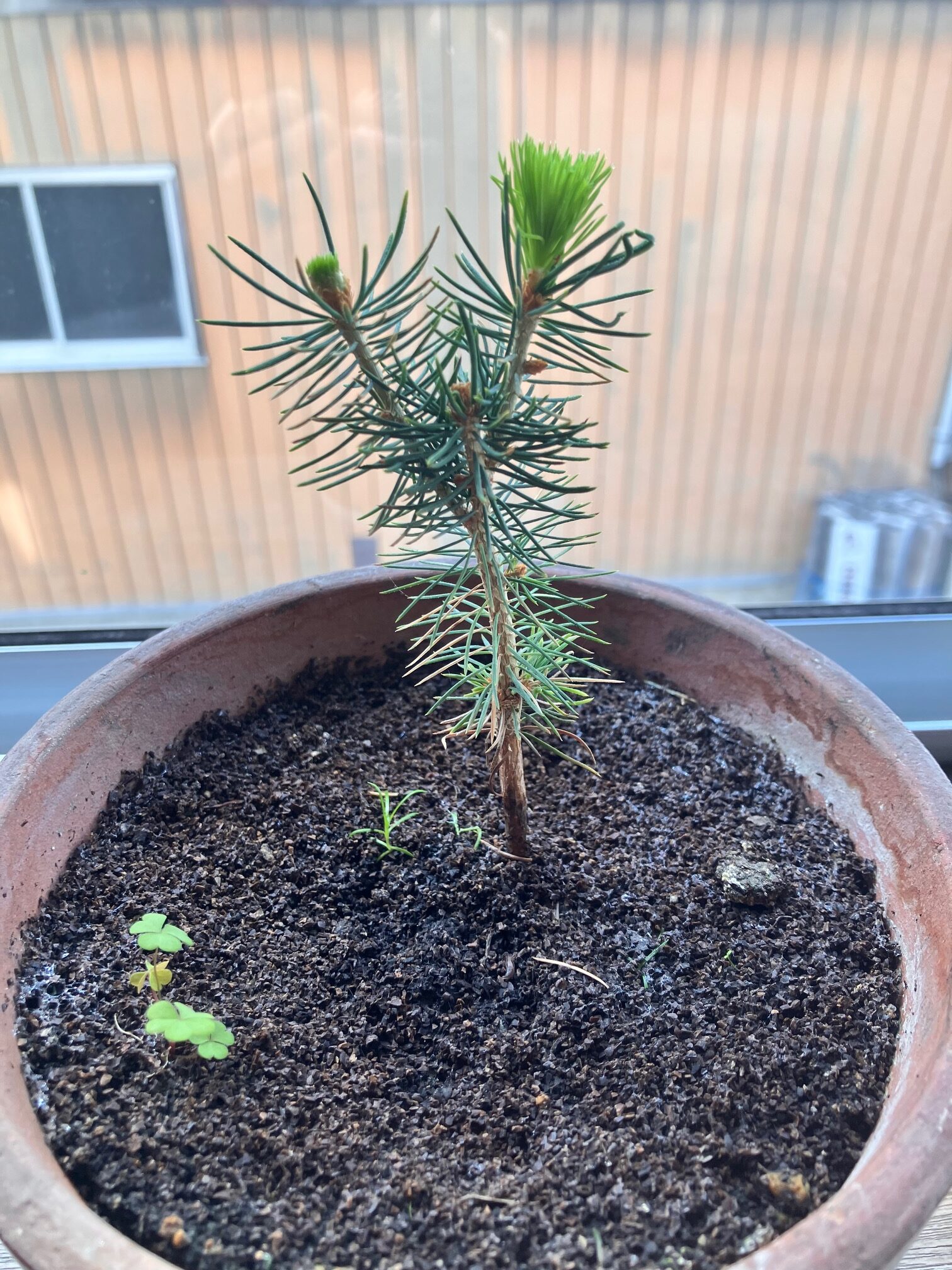 鉢の土には、どこからか紛れ込んだカタバミの小さな芽も顔を出していました。
